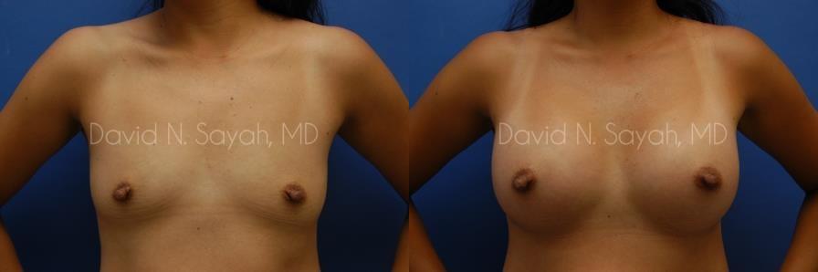 This 37-year-old woman came to the office of Dr. David Sayah with complaints about her small breasts. The patient felt that with age she had lost the youthful buoyancy and ampleness of her breasts. She was interested in breast augmentation at our Beverly Hills practice to add volume to her drooping breasts and hoped to increase her size to a full C cup.